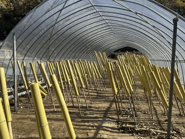 ハウスの中で干し上げるのですが、これで、毎日夜露に濡れずにすみます。