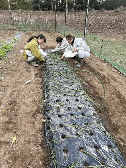 お湯が沸くまでの余った時間に、生徒達に手伝って貰い、玉ねぎの植え付け作業。
