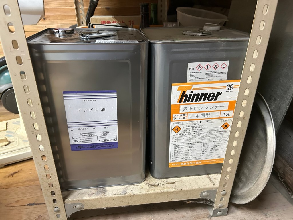 私の所では、漆の作業をする時に、テレピン油という溶液で漆を溶かしたり、刷毛を洗ったりするのだが、テレピン油が無くなるといけないと思い塗料屋さんに注文したが、